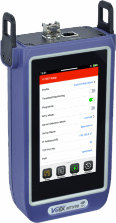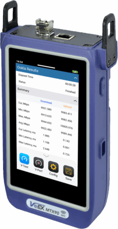 The MTX90 is an optimized Quality of Experience (QoE) test solution (Layer 4+ applications) for multi-Gigabit services from 10 Mbps to 10 Gbps, with native support for 2.5G, 5G, and 10GBASE-T on copper RJ45 and fiber SFP+ interfaces. It supports PON ONT emulation via SFP+, provides QoE validation using Speedtest and V-PERF, and enables Wi-Fi performance verification. It equips field technicians with the tools to quickly validate service speeds for residential and business subscribers.